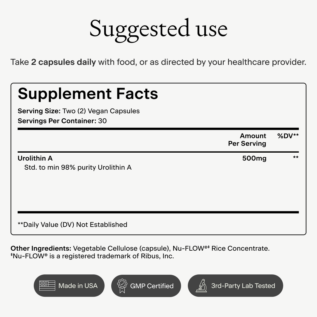 Ultra pure Urolothin A (98%) at research backed dose of 500mg to support mitochondrial health.*