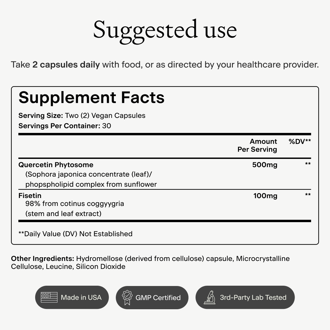 Our formula provides 500mg of Quercetin Phytosome for enhanced absorption and 100mg of Fisetin at 98% purity. It’s designed as a science-led senolytic formula to support healthy cell renewal.