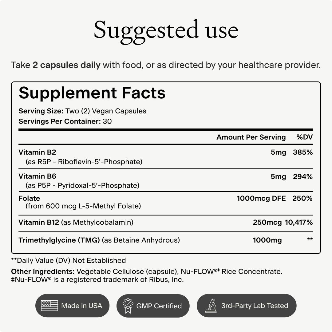 Includes active forms of B2, B6, folate (5-MTHF), and B12 to support methylation pathways and help keep the cycle running efficiently.*
